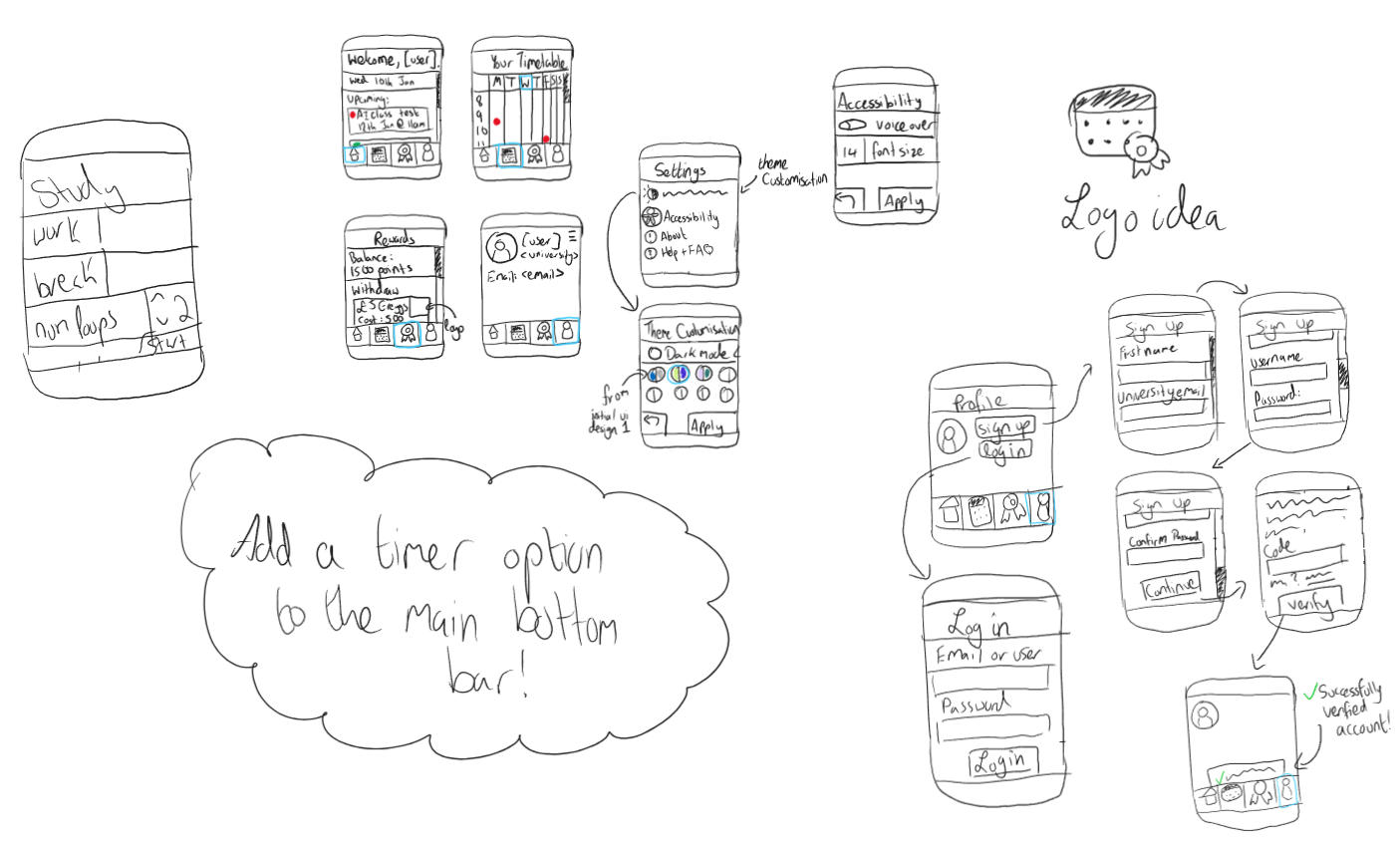 This sketch presents a lot of UI ideas for the main pages of the app, as well as functionality and how pages should link to each other. For example, in the bottom right corner of the picture above, it shows the login process, what each page could look like, and the arrows show the order of the pages.